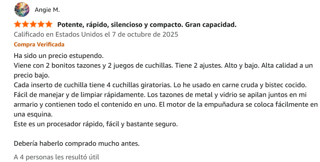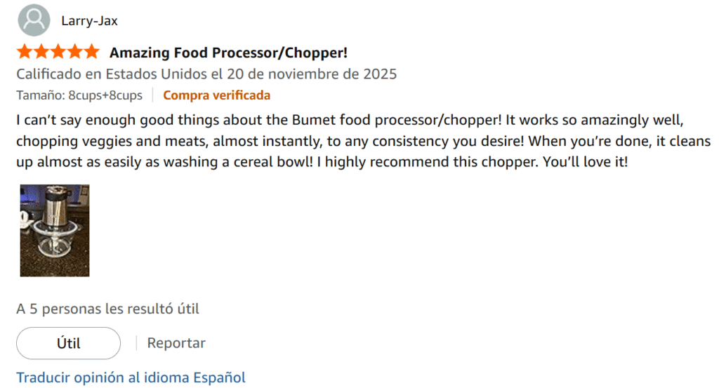 ¡No puedo decir suficientes cosas buenas sobre el procesador/picador de alimentos Bumet! ¡Funciona increíblemente bien, picando verduras y carnes, casi al instante, hasta obtener la consistencia que desees! Cuando termines, ¡se limpia casi tan fácilmente como lavar un tazón de cereal! Recomiendo encarecidamente esta picadora. ¡Te va a encantar!