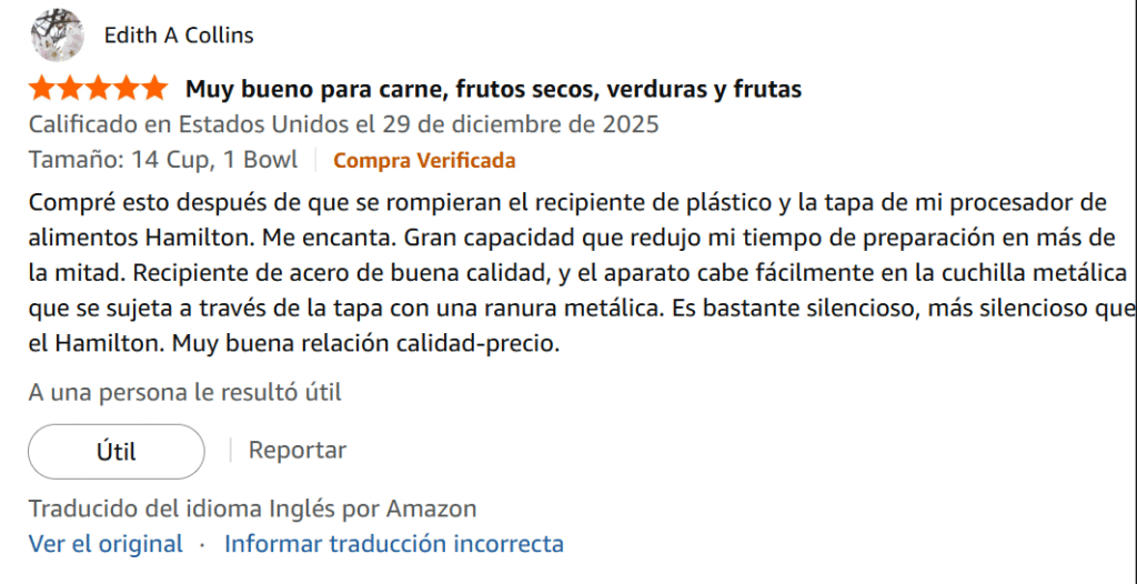Compré esto después de que se rompieran el recipiente de plástico y la tapa de mi procesador de alimentos Hamilton. Me encanta. Gran capacidad que redujo mi tiempo de preparación en más de la mitad. Recipiente de acero de buena calidad, y el aparato cabe fácilmente en la cuchilla metálica que se sujeta a través de la tapa con una ranura metálica. Es bastante silencioso, más silencioso que el Hamilton. Muy buena relación calidad-precio.