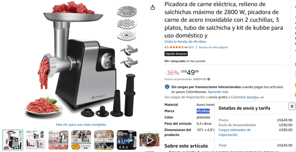 A continuación, te mostraremos una tabla comparativa de algunas máquinas picadoras de carne eléctricas, destacando sus diferentes precios. Si en Colombia encuentras algún producto igual o de menor costo, te recomendamos adquirirlo únicamente si el sitio es confiable, ya sea revisando los comentarios o las calificaciones de otros compradores.