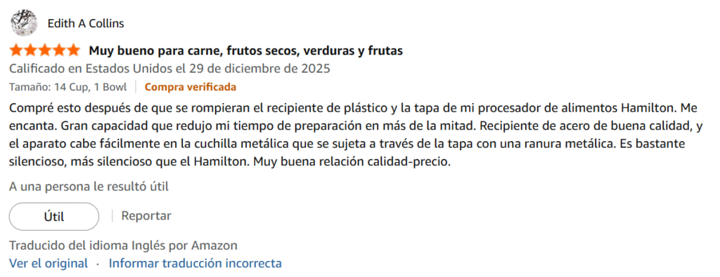 Compré esto después de que se rompieran el recipiente de plástico y la tapa de mi procesador de alimentos Hamilton. Me encanta. Gran capacidad que redujo mi tiempo de preparación en más de la mitad. Recipiente de acero de buena calidad, y el aparato cabe fácilmente en la cuchilla metálica que se sujeta a través de la tapa con una ranura metálica. Es bastante silencioso, más silencioso que el Hamilton. Muy buena relación calidad-precio.