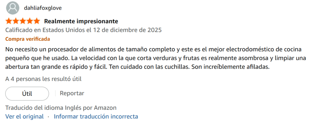 No necesito un procesador de alimentos de tamaño completo y este es el mejor electrodoméstico de cocina pequeño que he usado. La velocidad con la que corta verduras y frutas es realmente asombrosa y limpiar una abertura tan grande es rápido y fácil. Ten cuidado con las cuchillas. Son increíblemente afiladas.