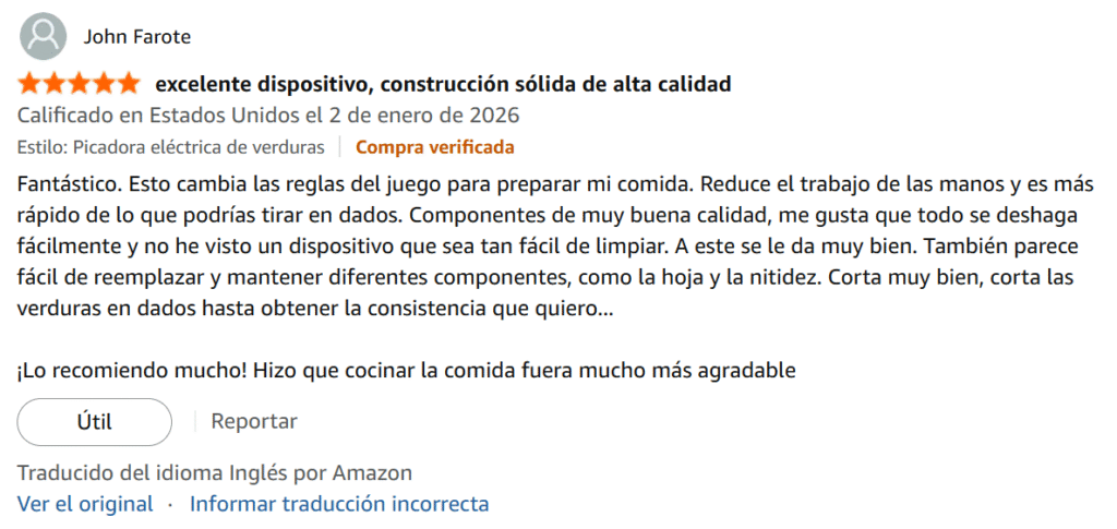 Fantástico. Esto cambia las reglas del juego para preparar mi comida. Reduce el trabajo de las manos y es más rápido de lo que podrías tirar en dados. Componentes de muy buena calidad, me gusta que todo se deshaga fácilmente y no he visto un dispositivo que sea tan fácil de limpiar. A este se le da muy bien. También parece fácil de reemplazar y mantener diferentes componentes, como la hoja y la nitidez. Corta muy bien, corta las verduras en dados hasta obtener la consistencia que quiero…