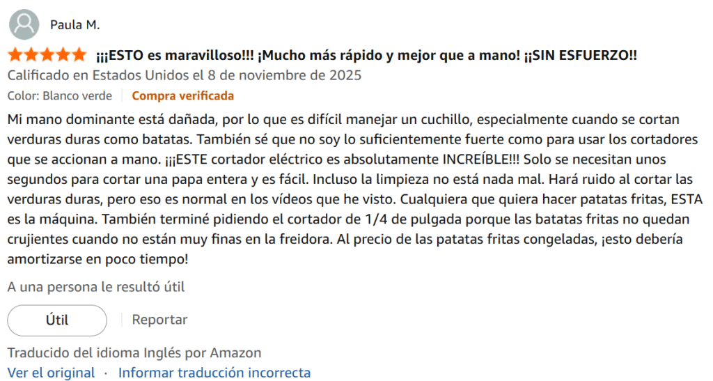 Mi mano dominante está dañada, por lo que es difícil manejar un cuchillo, especialmente cuando se cortan verduras duras como batatas. También sé que no soy lo suficientemente fuerte como para usar los cortadores que se accionan a mano. ¡¡¡ESTE cortador eléctrico es absolutamente INCREÍBLE!!! Solo se necesitan unos segundos para cortar una papa entera y es fácil. Incluso la limpieza no está nada mal. Hará ruido al cortar las verduras duras, pero eso es normal en los vídeos que he visto. Cualquiera que quiera hacer patatas fritas, ESTA es la máquina.